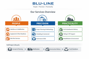 Blu-Line delivers structured, risk-based solutions across civil construction, bulk earthworks, tailings storage facilities, and rehabilitation projects, integrating strong operational governance with disciplined execution. We support clients and contractors through planning, methodology development, workforce and plant readiness, QA/QC oversight, and commercial advisory to ensure projects are delivered safely, efficiently, and with clarity.